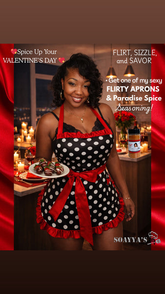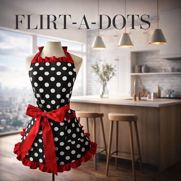 This flirty apron is a must have for the Queen of the kitchen. Fits any body shape. Long Red , Teal, or Pink wrap around tie , that ties into a bow to the side .